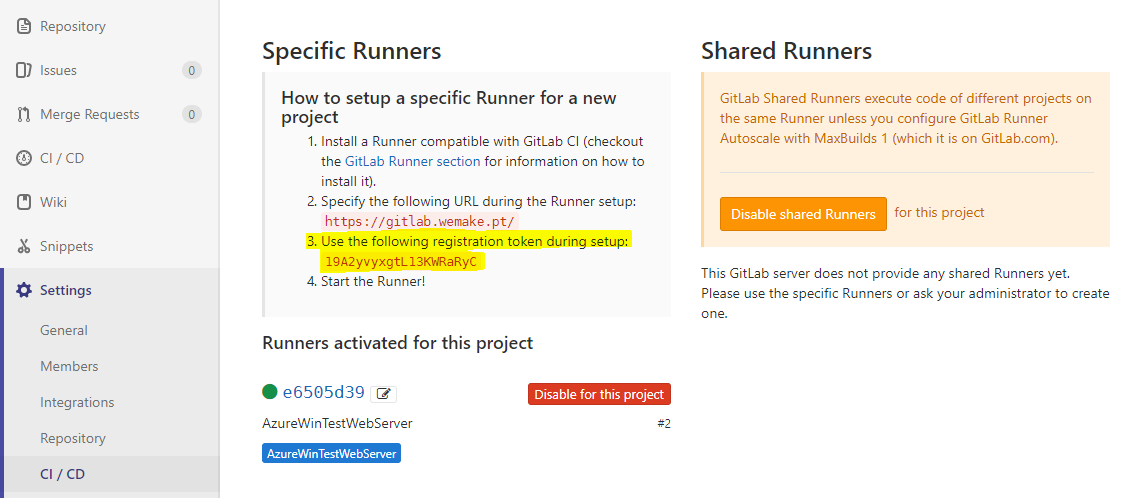 Although the runner can be shared on multiple project, during the registration we still have to enter a token of a project for the runner. The token is available on the menu option Settings > CI / CD of the project